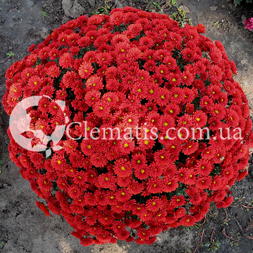 окрас соцветия красный, до 4см в диаметре. Куст хорошо разветвленный, идеальный шар. Цветение очень обильное.