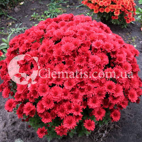 окрас соцветия красно малиновый, до 5 см в диаметре. Куст хорошо разветвленный, идеальный шар. Цветение обильное.