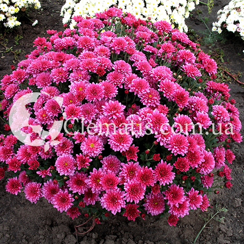 окрас соцветия темно розово лиловый, до 4-5см в диаметре. Куст хорошо разветвленный, шарообразный. Цветение очень обильное.