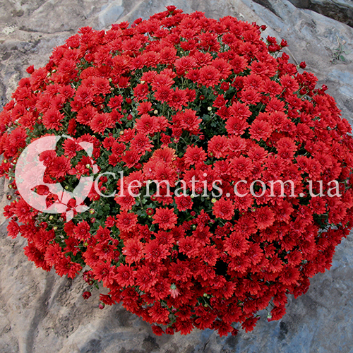 окрас соцветия красный, до 4 см в диаметре. Куст хорошо разветвленный, идеальный шар. Цветение очень обильное.