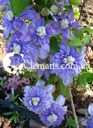 Цветки большие лавандово-голубые, с темно голубыми прожилками, махровые на прошлогодних и побегах текущего года.