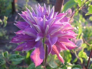 Квітки великі, махрові, на початку цвітіння чашолистки злегка згорнуті – квітки як їжачки, потім махрові квітки широко розкриті. Чашолистки лавандово-блакитні.